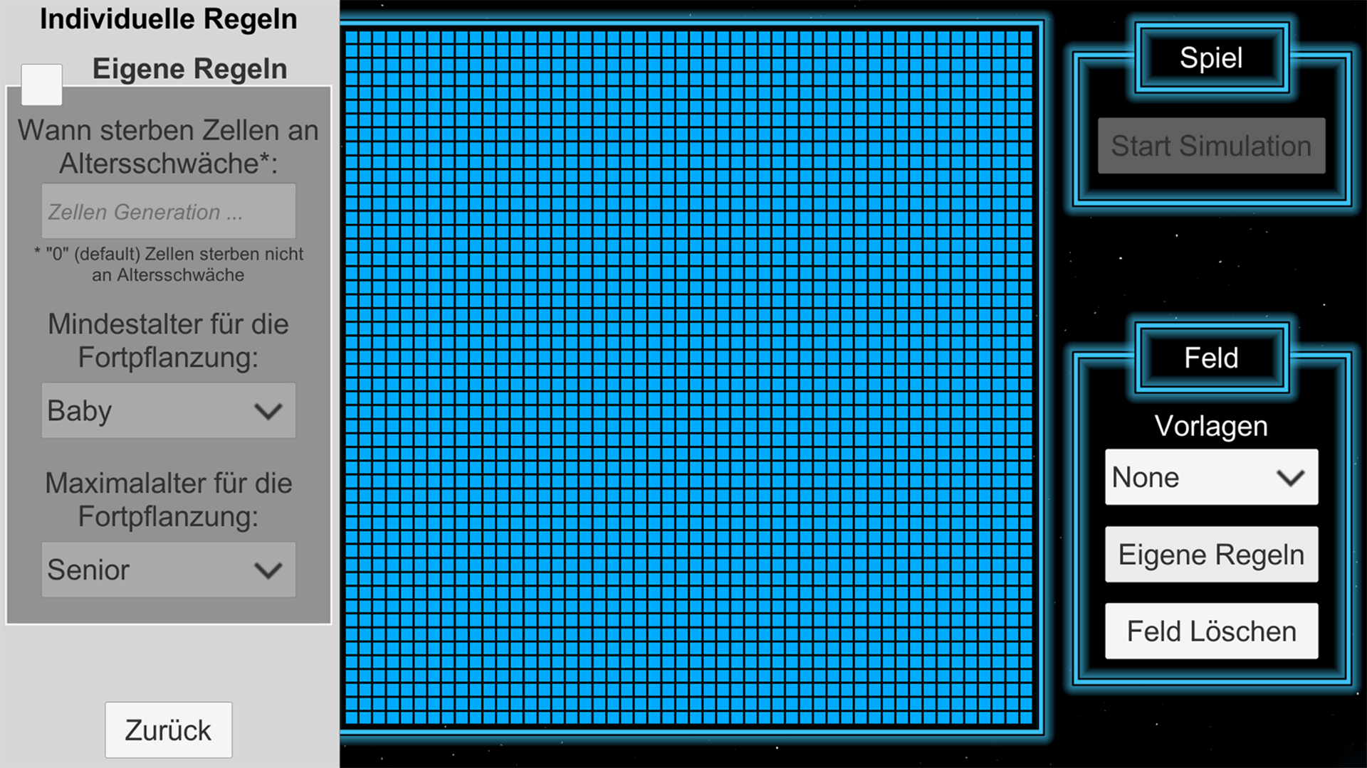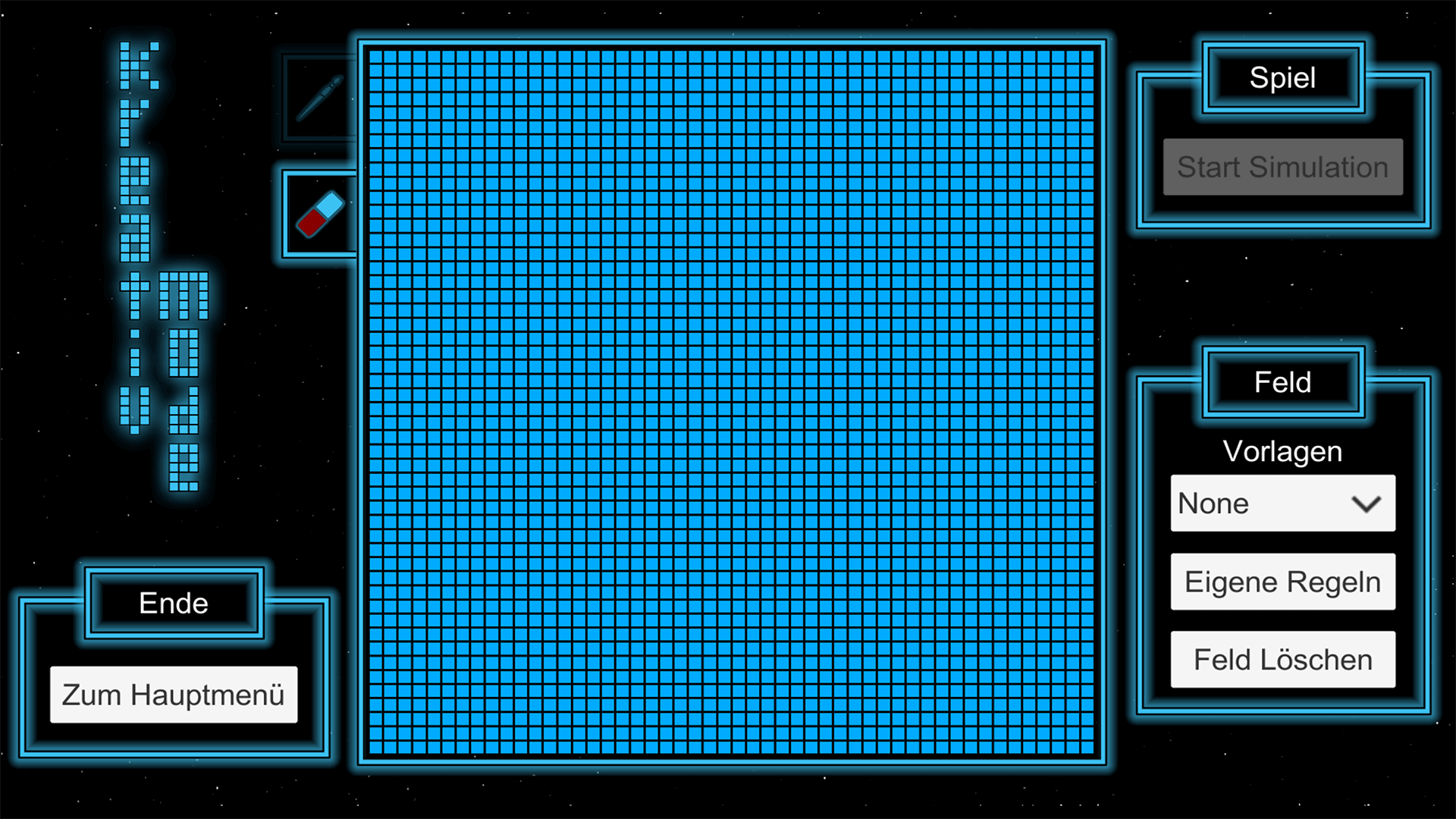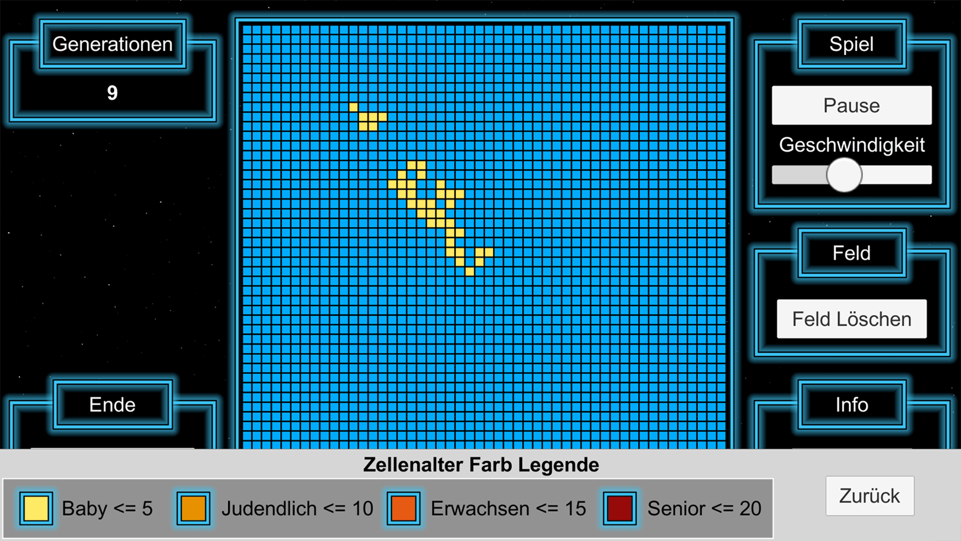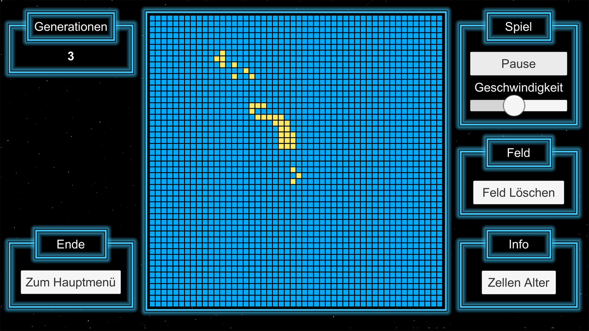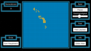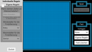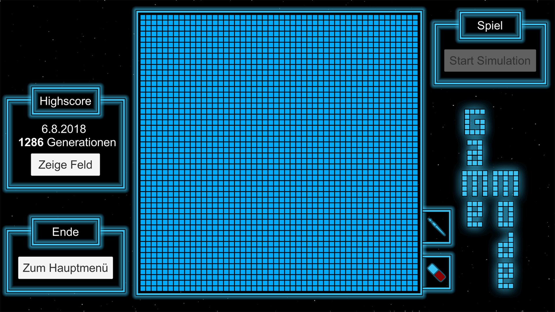 Im Gamemodus lässt sich das Startmuster nur am Start der Simulation anpassen. Danach müssen die Zellen aus diesem Startmuster so viele Generationen wie möglich überleben. Ziel ist es dann deinen persönlichen Highscore an überlebten Generationen zu knacken.